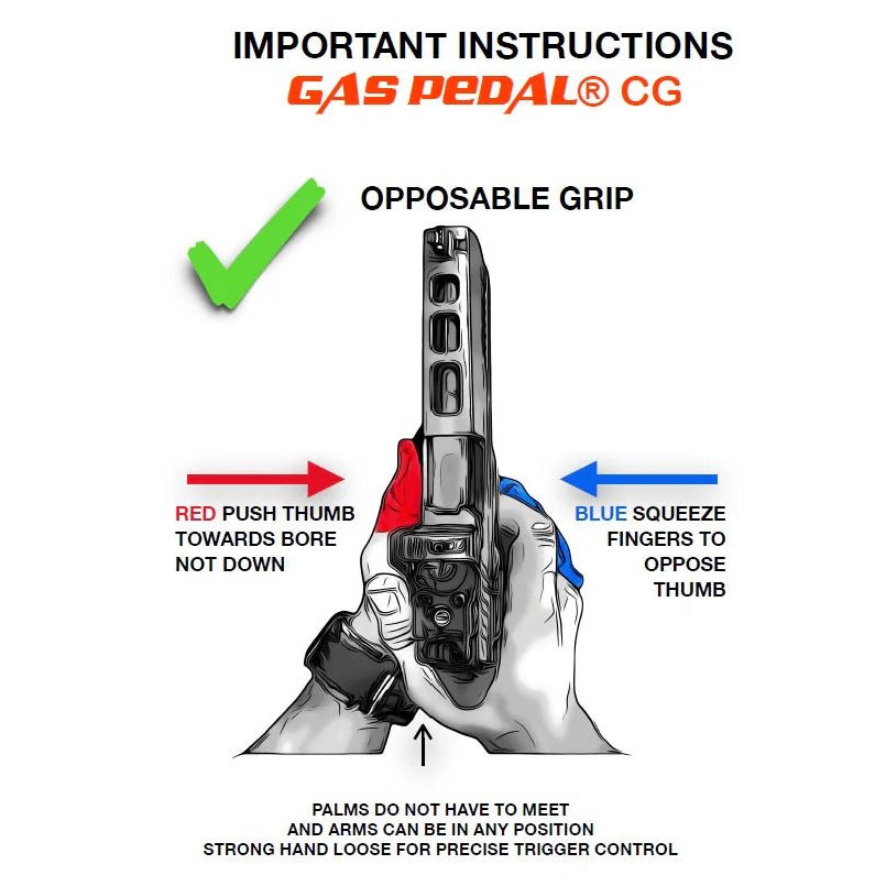The Gas Pedal® Assist transforms pistols into controllable, accurate tools for everyday carry and self-defense and gives the enhanced control necessary for range and competition shooting. Combined with the Opposable Grip technique, it dramatically improves recoil control, speed, and accuracy—even for shooters without big or strong hands.