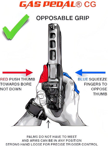 The Gas Pedal® Assist transforms pistols into controllable, accurate tools for everyday carry and self-defense and gives the enhanced control necessary for range and competition shooting. Combined with the Opposable Grip technique, it dramatically improves recoil control, speed, and accuracy—even for shooters without big or strong hands.